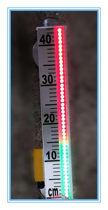 在液位計主導管內(nèi)有一個磁性浮子,浮子根據(jù)介質(zhì)比重設計,浮子內(nèi)磁鋼與容器內(nèi)液面同一高度,液位LED顯示標尺內(nèi)裝有半導體磁敏傳感器,并和LED發(fā)光模塊上下有序排列,與磁場相對應的半導體磁敏傳感器受磁,觸發(fā)相應的數(shù)字電路,液位以上LED紅色顯示,液位以下LED綠色顯示,紅色顯示汽相,綠色顯示液相,紅綠交界處就是容器內(nèi)的實際液位,液綠汽紅,一目了然。