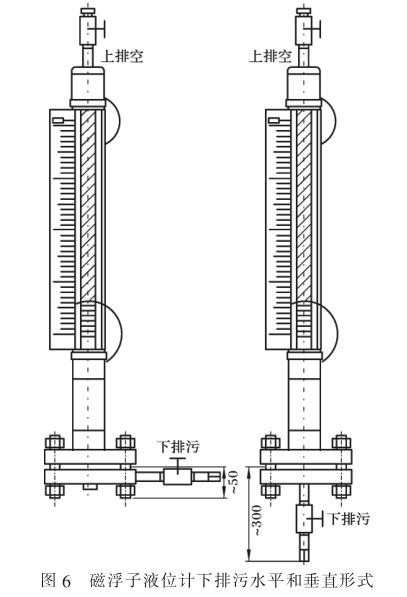 磁翻板液位計(jì)是一種常見的液位計(jì),磁翻板液位計(jì)與玻璃管液位計(jì),玻璃板液位計(jì),石英管液位計(jì)等液位儀表類似,都有一套與測(cè)量容器相連的連通器管道,由于長(zhǎng)時(shí)間的使用,難免會(huì)有測(cè)量容器中的雜質(zhì)等在連通測(cè)量管中產(chǎn)生深積,因此此類液位計(jì)安裝時(shí),一般會(huì)配套排污閥門,正常都選用側(cè)—側(cè)連接方式,帶放空和排污。因此, 應(yīng)根據(jù)預(yù)留空間, 決定放空或排污采用垂直(常用)或水平的安裝形式,如下圖所示。