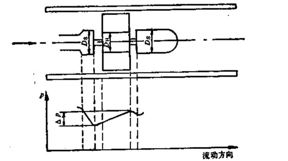 由于流體通過渦輪時會對渦輪產(chǎn)生一個軸向推力,使鈾承的摩擦轉(zhuǎn)矩增大,加速鈾承磨損,為了消除軸向力,需在結(jié)構(gòu)上采取水力平衡措施,這方法的原理見圖3-3所示。由于渦輪處直徑DH略小于前后支架處直徑Ds,所以,在渦輪段流通截而擴大,流速降低,使流體靜壓上升 P,這個 P的靜壓將起到抵消部分軸向推力的作用。