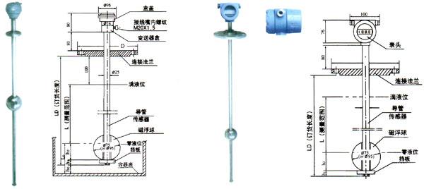 浮球液位計(jì)由浮球、插桿等組成。浮球液位計(jì)通過(guò)連接法蘭安裝于容器頂上,浮球根據(jù)排開(kāi)液體體積相等等原理浮于液面,當(dāng)容器的液位變化時(shí)浮球也隨著上下移動(dòng),由于磁性作用,浮球液位計(jì)的干簧受磁性吸合,把液面位置變化成電信號(hào),通過(guò)顯示儀表用數(shù)字顯示液體的實(shí)際位置,浮球液位計(jì)從而達(dá)到液面的遠(yuǎn)距離檢測(cè)和控制。