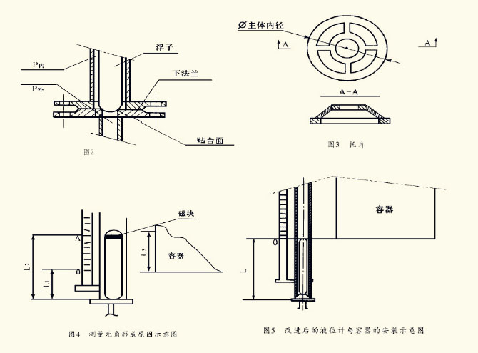 磁翻板液位計(jì)排污后,發(fā)現(xiàn)浮子不能起浮,檢查后注意到是其主要原因是:液位計(jì)排污后,浮子下落,浮子下部的球形封頭與下法蘭中心孔上倒角面緊密貼合(見圖2),加上主體內(nèi)存在較高的壓力,P內(nèi)>P外,使浮子緊壓在下法蘭上不能浮起。主體內(nèi)有油污時(shí),上述情況更易發(fā)生。