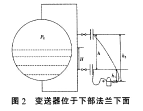 變送器位于下部法蘭下面.和圖1一樣使用常用的高壓側(cè)接下面、負(fù)壓側(cè)接上面的引壓方式,變送器的布置和常規(guī)電廠高加液位測量以及常見密閉容器測量液位一樣.如圖2所示 這種安裝方式一般需要把變送器布置于容器所在平臺(tái)的下一層變送器正壓側(cè)所受的壓力為: