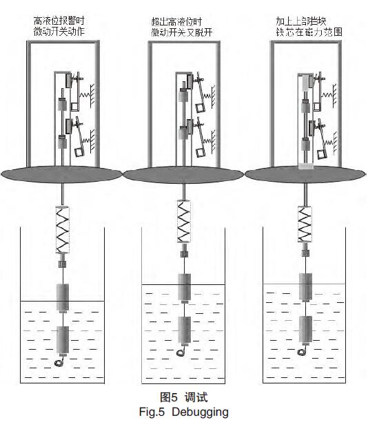 3)在調試過程中,發(fā)現(xiàn)液位開關沒有自保持功能,當高報警點過后,液位再往上升則高液位報警會消除,低液位時也是同樣,在分析原因后發(fā)現(xiàn),鐵芯在套筒內移動的位置不當是造成不能自保持的原因,如圖5所示,于是在套筒內的鐵芯上方加一阻擋塊,使高液位超出時,鐵芯被阻擋塊擋住,不再向上移動,從而不會脫出微動開關的磁力范圍,對低液位報警的自保持是在鐵芯的下部加一個環(huán)型的墊片,阻止鐵芯向下移動超出微動開關的磁力范圍。從而提高了可靠性和重復性。接下來的調試中,又出現(xiàn)了一些零零碎碎的問題,如磁鐵磁性不夠,或者彈簧彈性不夠,彈簧的抗疲勞性差。元器件的材料和加工工藝不理想,出于對核電的安全性和穩(wěn)定性的考慮,開始考慮使用國內公司的產品,在試用后沒有出現(xiàn)以上的問題,于是決定從新采購一批國內的液位開關,將有問題的液位開關更換成國內的產品。